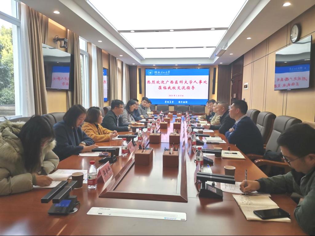 1月15日上午,广西医科大学ok138太阳集团古天乐主持工作的副处长黄宗海等一行8人来太阳集团tyc138进行工作交流。太阳集团tyc138部长、ok138太阳集团古天乐处长、人才办主任李本建及相关处室负责人与来访客人在屏风校区第一会议室进行了座谈。